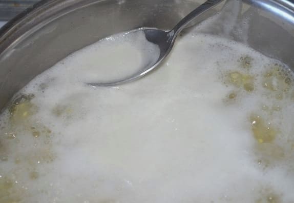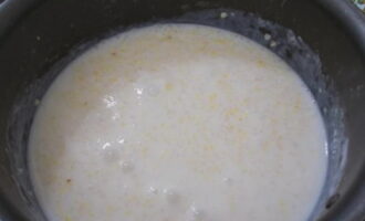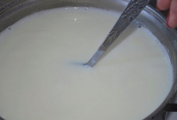 Verwarm de melk afzonderlijk, giet het in een pan met de inhoud. Voeg hieraan zout en suiker toe. We blijven nog 15 minuten koken op laag vuur.