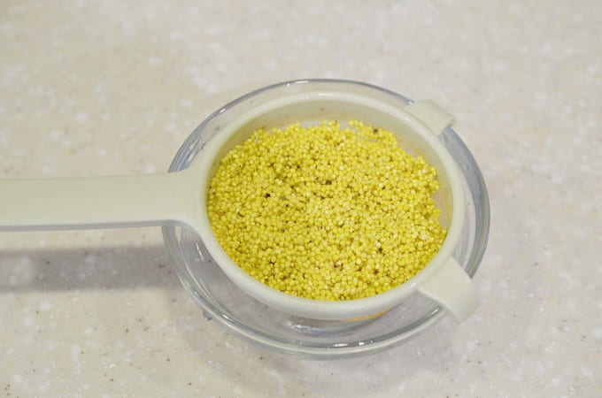 Giet gierst met een kleine hoeveelheid kokend water en laat het 10-15 minuten trekken. Dit verwijdert de bitterheid van het product en maakt het zachter.