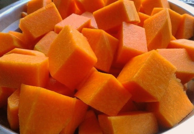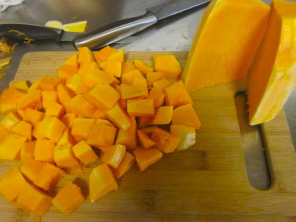 - Bevrijd de pompoen van zaden en schil. We wassen het fruit en snijden het in kleine blokjes.