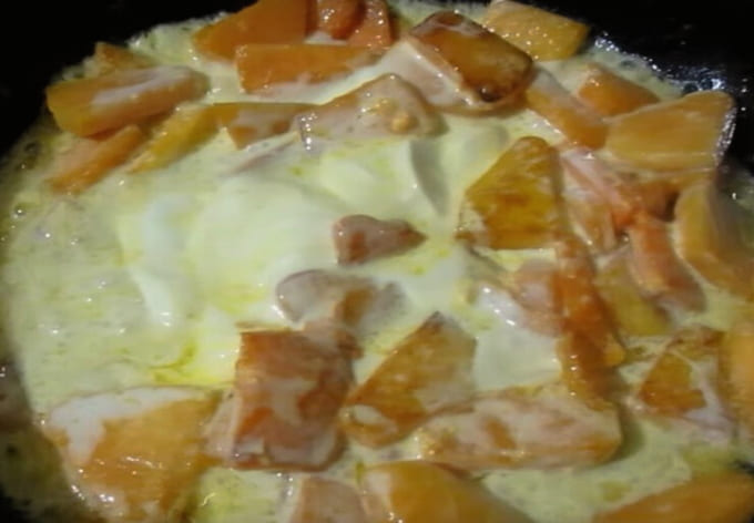 - Doop granen en suiker in kokende melk met verzachte pompoen. We maken het vuur kleiner en koken het gerecht nog 20 minuten onder het deksel.
