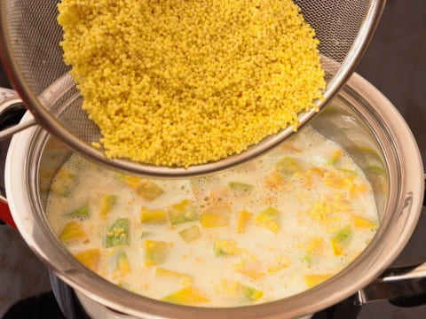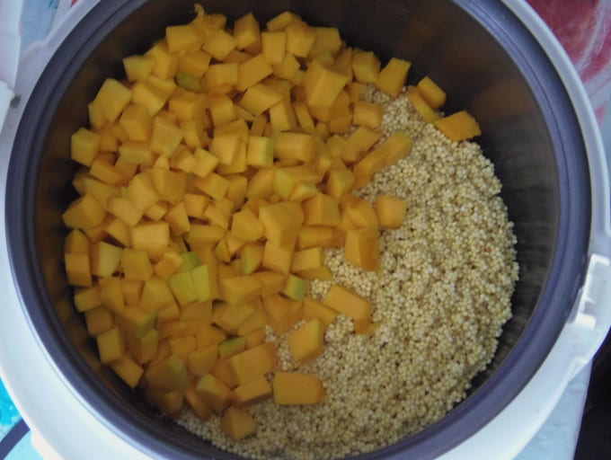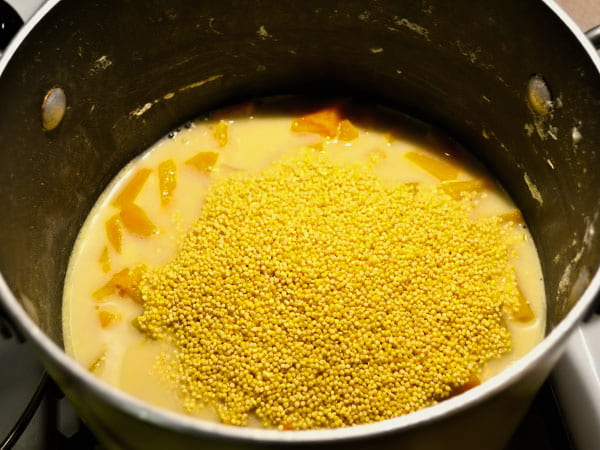 - Meng de pompoen in een pan of steelpan met melk, zout en suiker. Breng aan de kook op het vuur, doe dan de gewassen rijst en apart gewassen gierst in de massa. Kook op laag vuur ongeveer 15 minuten.