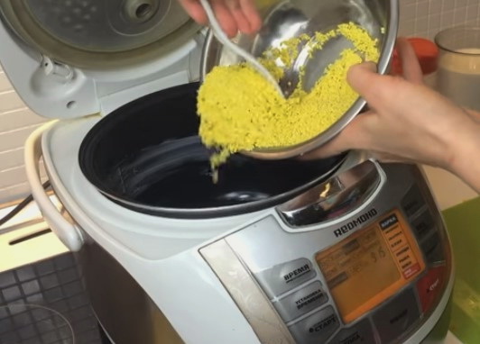 - Bestrijk de multicooker-kom grondig met boter. We verspreiden hier rijst (voorgekookt kun je niet spoelen) en bereide gierst.