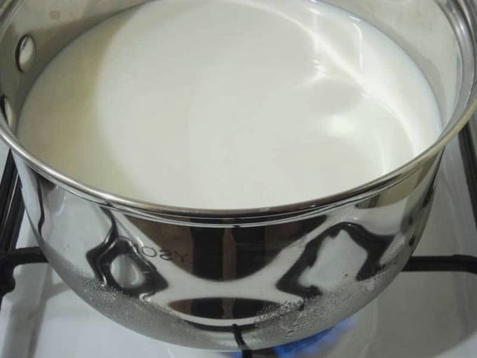- Combineer water met melk in een pan of steelpan. Verwarm op het fornuis, maar kook niet.