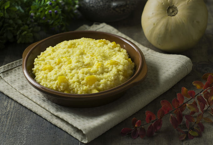 - Pap Vriendschap van granen en pompoen is klaar. Roer het door elkaar, leg het op borden en serveer het op tafel.