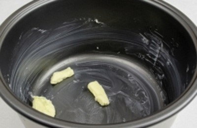 - Bestrijk een schone en droge multicooker-kom voorzichtig met een stuk boter. Het is voldoende om alleen op de bodem van de schaal te verwerken.