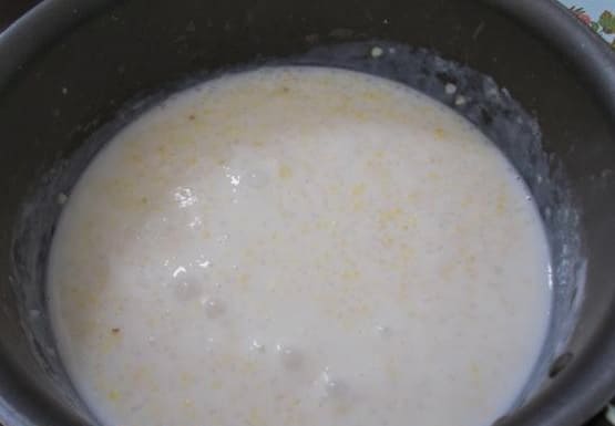 Verwarm de melk afzonderlijk, giet het in een pan met de inhoud. Voeg hieraan zout en suiker toe. We blijven nog 15 minuten koken op laag vuur.