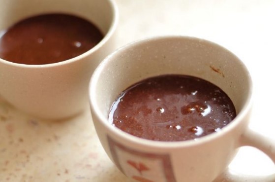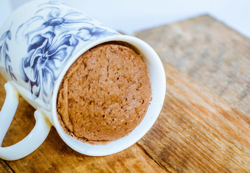 - Zet de deegmok 2,5 minuut in de magnetron op het hoogste vermogen. Controleer de gereedheid van het product met een houten tandenstoker. En nog iets: de randen van de gebakken cake moeten van de zijkanten van de mok loslaten.