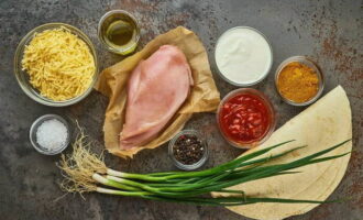 We zullen de nodige producten klaarmaken. Ontdooi de kipfilet vooraf, rasp de harde kaas.