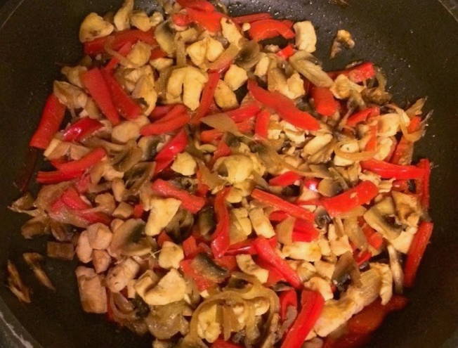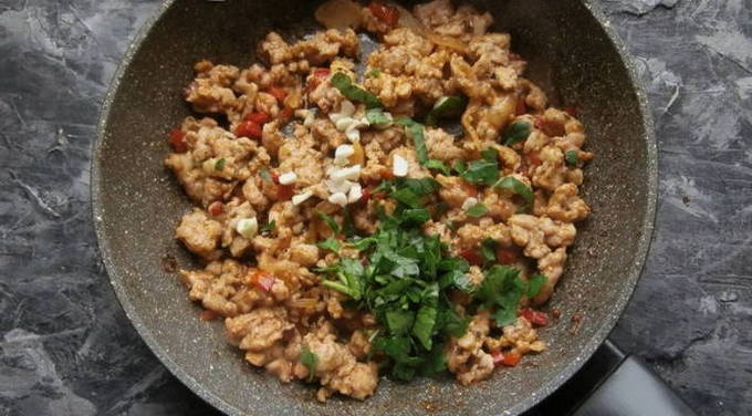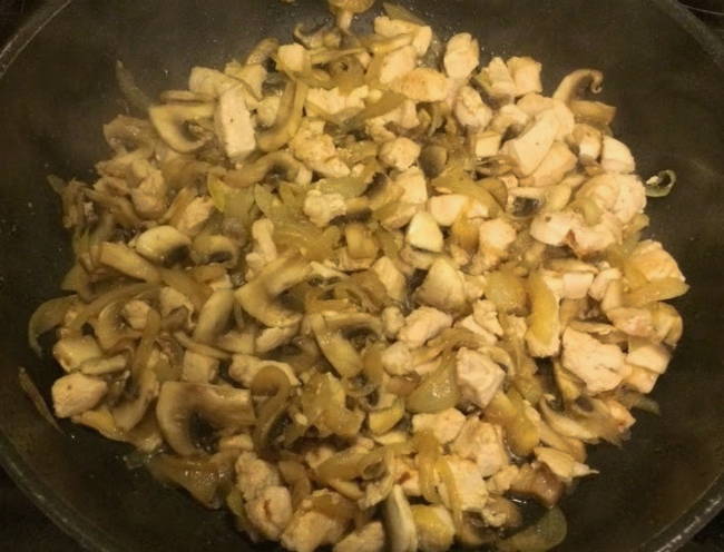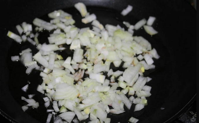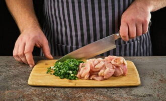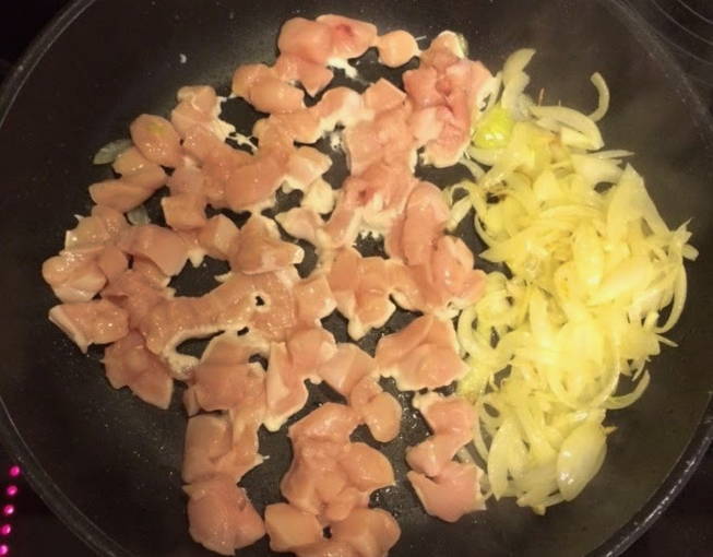 - Bak uien in plantaardige olie en vul het vervolgens aan met kleine stukjes kipfilet.