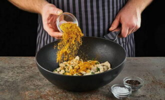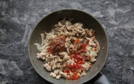 Bak stukjes kip in plantaardige olie. We vullen ze aan met uien, zout, kruiden naar smaak en tomatenpuree. Bak 5 minuten.