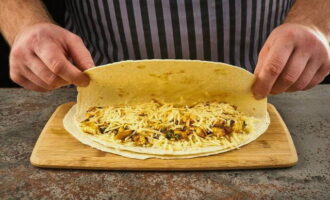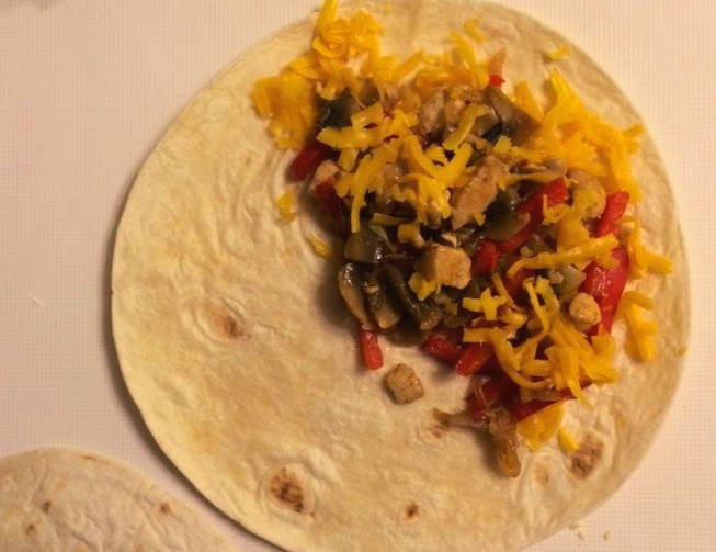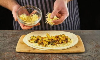 - Leg de afgewerkte kip- en champignonsvulling op een halve tortilla. Bestrooi met geraspte kaas erover.