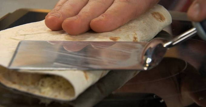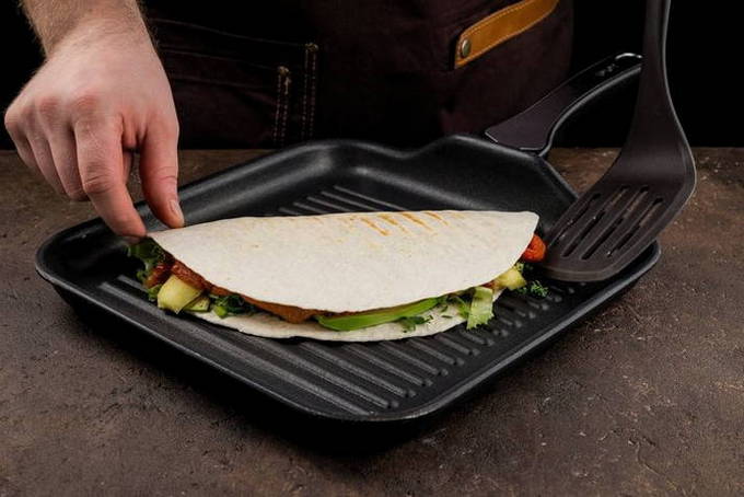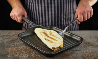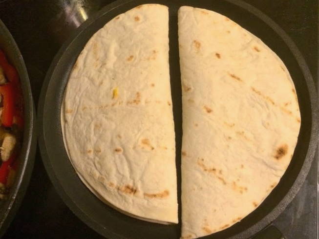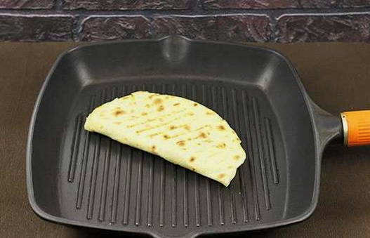 - Bedek de vulling met de tweede tortilla. Draai het werkstuk na 2 minuten om.