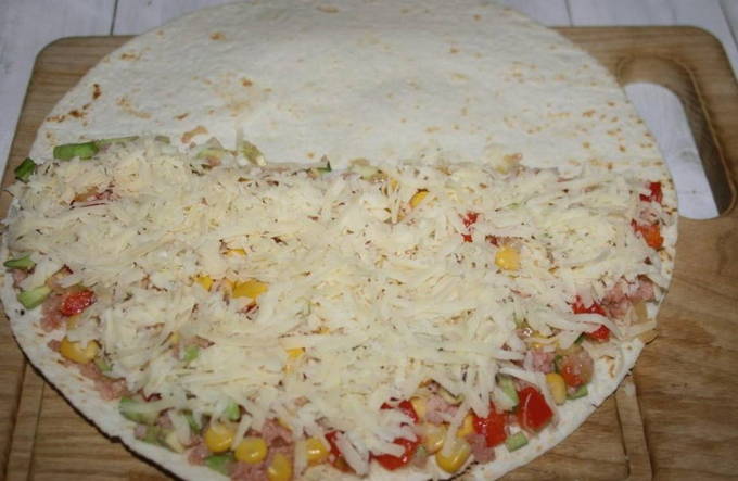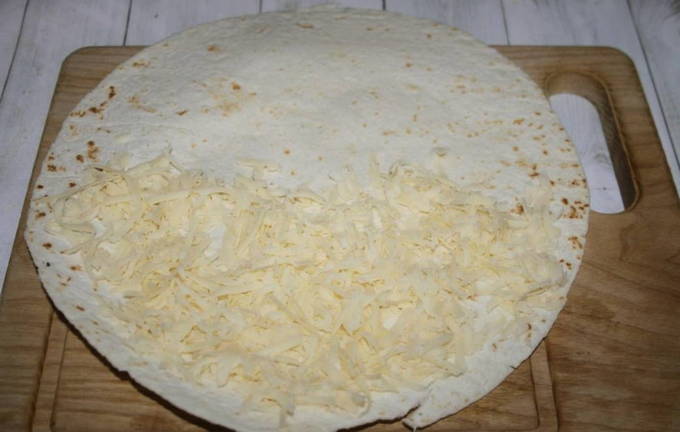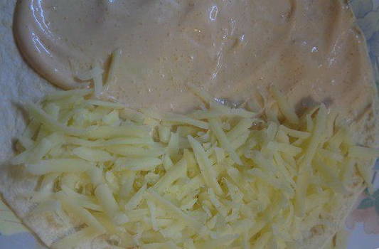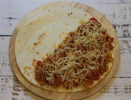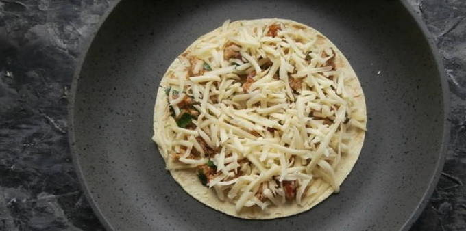 - Doe de resulterende saus op een helft van de tortilla. Bestrooi met geraspte kaas erover.
