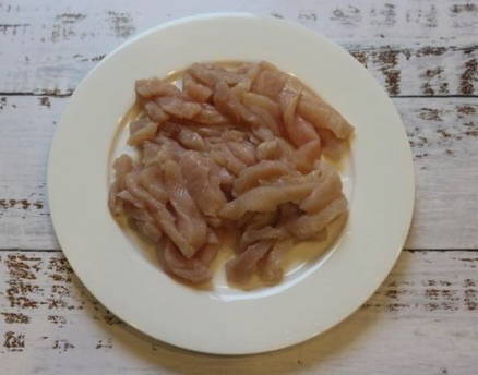 - Ontdooi en spoel de kipfilet. Snijd het in dunne reepjes.