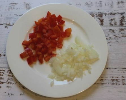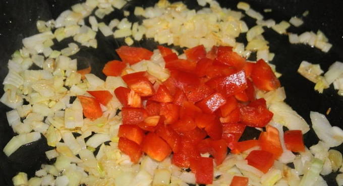 - Na het verschijnen van een gouden kleur vullen we de groente aan met stukjes paprika.
