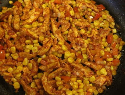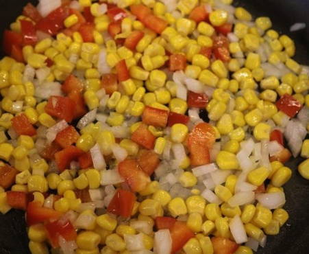 - Bak groenten in plantaardige olie. Voeg ingeblikte maïs toe aan hen.