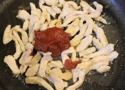 - Bak de kip apart. Zout het en giet over tomatenpuree.