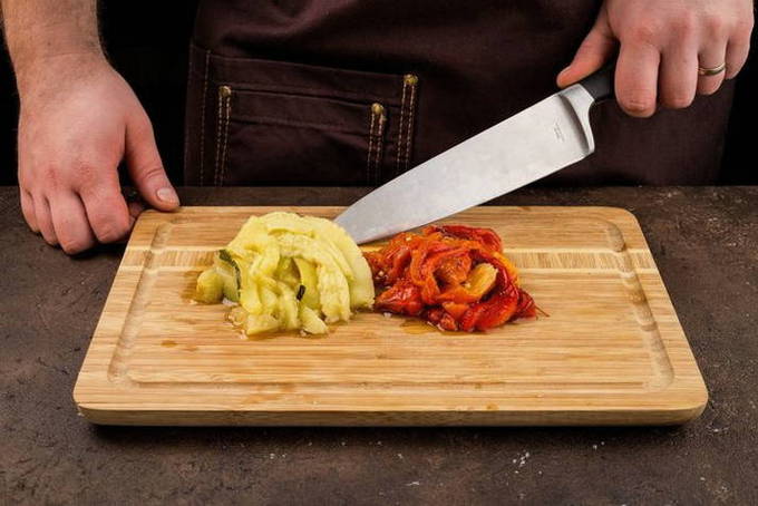 - Courgette met paprika moet in de oven worden gebakken tot hij zacht is. Daarna moeten ze fijn worden gesneden.