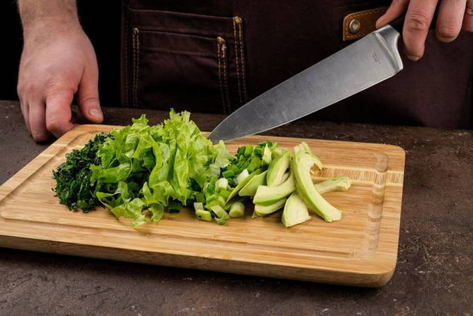 - Ook snijden we de salade, kruiden en avocado in kleine stukjes.