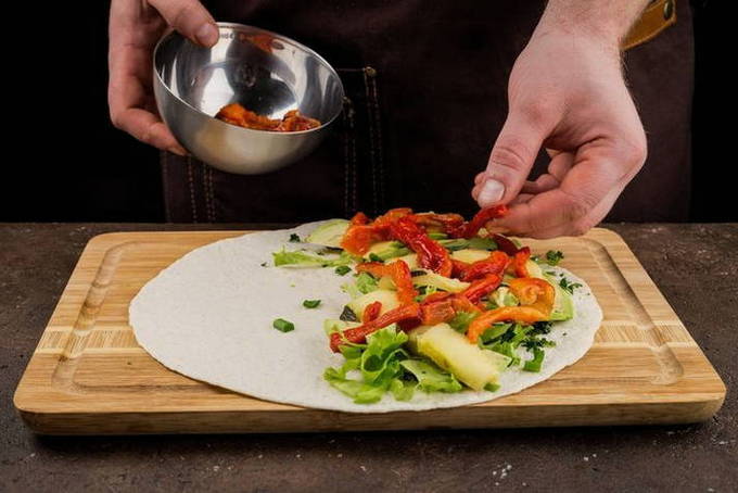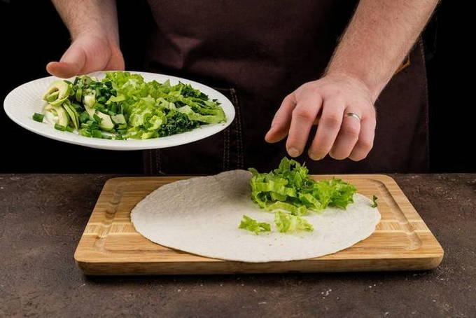 - Zout de vulling en bestrooi met kruiden. We sluiten de tortilla's met de tweede helften en sturen ze naar de pan met plantaardige olie.