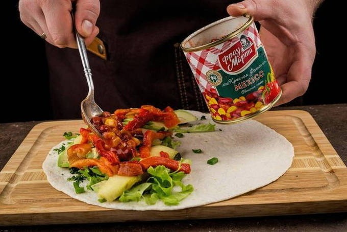 - Leg dan tomaten, stukjes ui en maïs. Vouw de cakes dubbel en stuur ze naar een voorverwarmde pan. Bak tot ze aan beide kanten licht blosen.