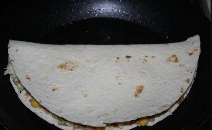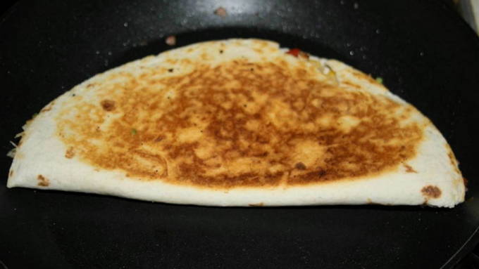 - Sluit de vulling met de tweede helft van de tortilla en doe in de pan.