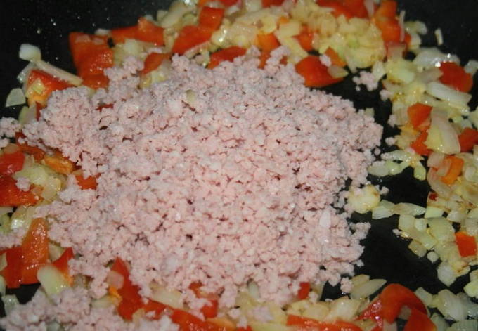 - We bakken de massa nog 5-7 minuten, daarna vullen we het aan met stukjes paprika, zout en besprenkelen met kruiden naar smaak.