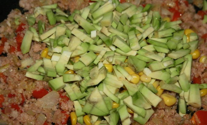 - Voeg wat avocado toe. Laat op middelhoog vuur ongeveer 5 minuten sudderen en haal van het vuur.