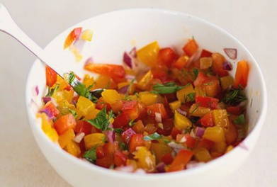 - Eerst wassen we de groenten en kruiden, hakken ze en leggen ze op een gemeenschappelijk bord. Zout, peper, overgieten met citroensap en goed kneden. Dit is handig voor het serveren van Mexicaanse lekkernijen.