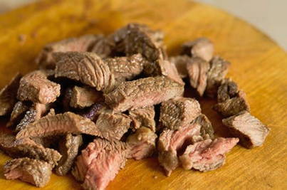 - Snijd een stuk rundvlees in reepjes. Bak de stukjes in plantaardige olie tot ze gaar zijn. Zout naar smaak.
