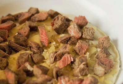 - Dip de tortilla in de pan. Leg er kaas en rundvlees op. Sluit de vulling met de tweede flatbread en bak de blanco aan beide kanten.