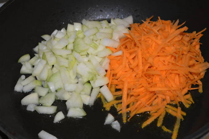 - We wrijven de wortels en hakken de gepelde uien fijn. Bak groenten tot ze blozen in plantaardige olie. Zout ze naar smaak.