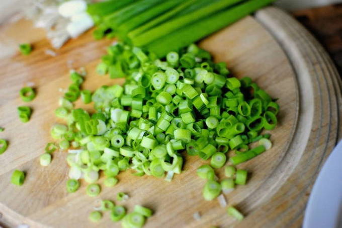 Daarna snijden we het vlees in kleine stukjes. We doen hetzelfde met groene uien.