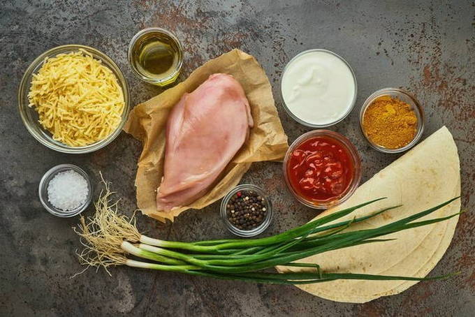 We zullen de nodige producten klaarmaken. Ontdooi de kipfilet vooraf, rasp de harde kaas.