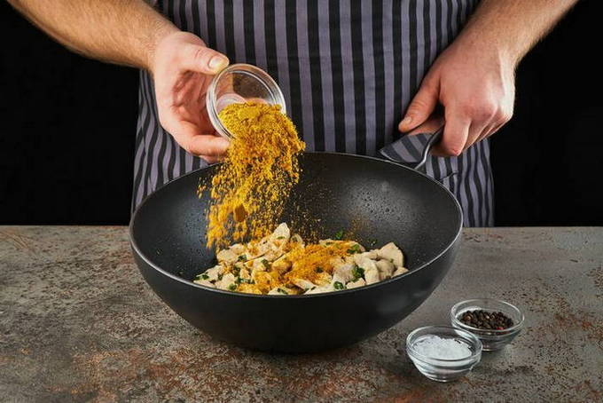 - Bak uien in plantaardige olie en vul het vervolgens aan met kleine stukjes kipfilet.