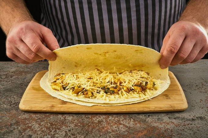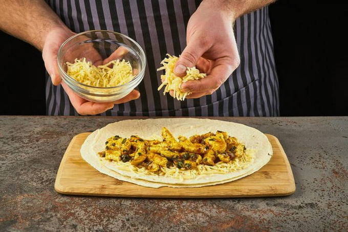 - Leg de afgewerkte kip- en champignonsvulling op een halve tortilla. Bestrooi met geraspte kaas erover.
