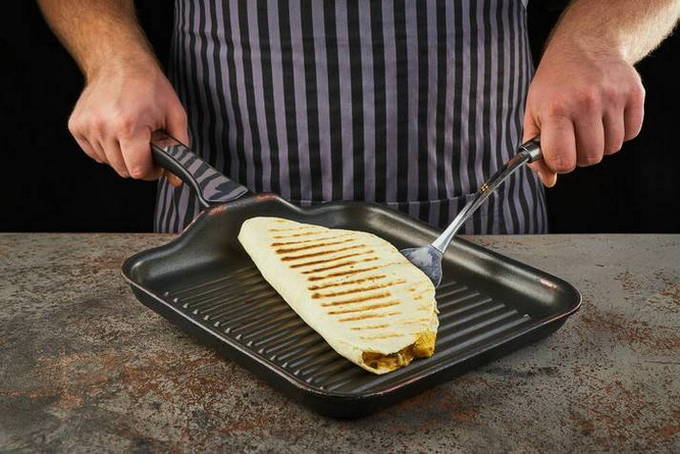 - Bedek de vulling met de tweede tortilla. Draai het werkstuk na 2 minuten om.