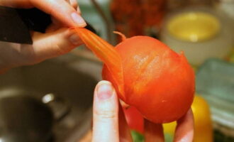 - We wassen de tomaten, laten ze drogen. Verwijder de schil: vul de tomaten met gekookt water en laat een paar minuten staan. Daarna zetten we het in koud water. Verwijder de huid na 2-3 minuten gemakkelijk.
