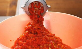 We wassen de peper met stromend water. Veeg met een handdoek, verwijder de paardenstaarten en de kern. Snijd de groente in kleine stukjes en maal door een vleesmolen. We sturen gehakte paprika's naar tomaten. Voeg hete en zwarte peper, kruidnagel toe. Wij mixen de producten.