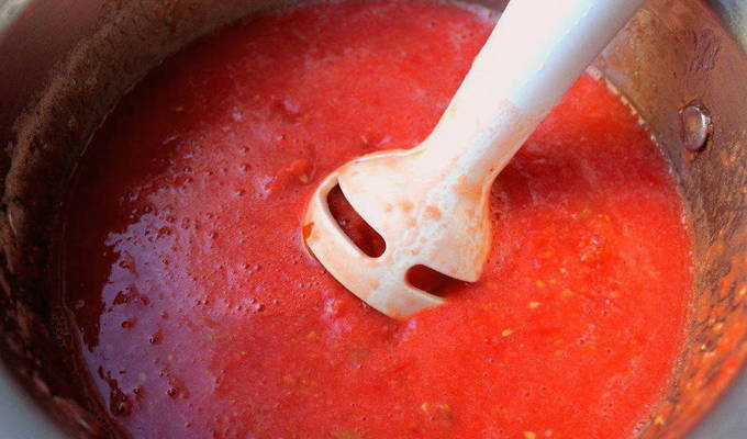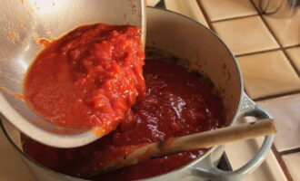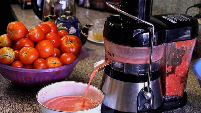 We persen het sap van tomaten met behulp van een sapcentrifuge of op een andere handige manier in een pan. We zetten de container op de brander, zetten het fornuis aan. Kook het sap ongeveer twee uur. De massa moet met 2 keer worden verminderd.