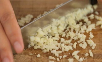 - We proberen de knoflook zo fijn mogelijk te hakken. Voeg het 5-7 minuten voor het einde van het koken toe aan de saus. We sturen na zwarte gemalen peper. Breng het mengsel weer aan de kook.