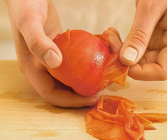 Spoel de tomaten eerst af en veeg ze af met een theedoek. Dan pellen we ze af. Om de schil gemakkelijker en sneller te verwijderen, giet je een paar minuten kokend water over de tomaten en zet je ze in koud water.