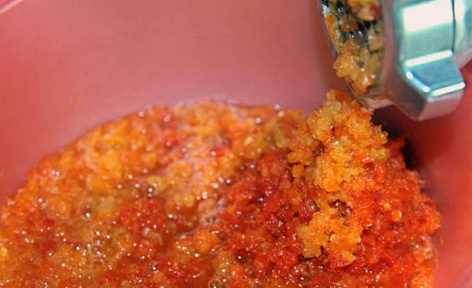 - Schil de paprika's en uien. Verwijder de schil van de ui. We wassen de paprika. We snijden het fruit in de lengte in twee delen, verwijderen de kern. We snijden alle ingrediënten in grote stukken. Maal met een vleesmolen of blender.