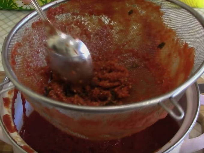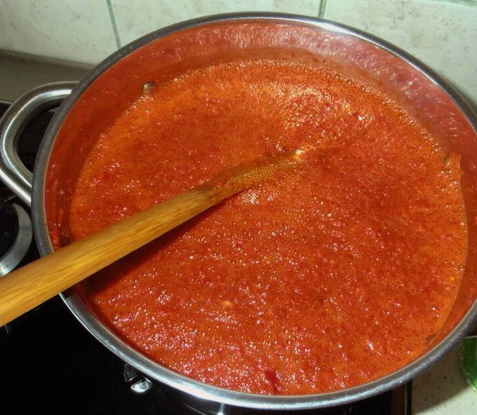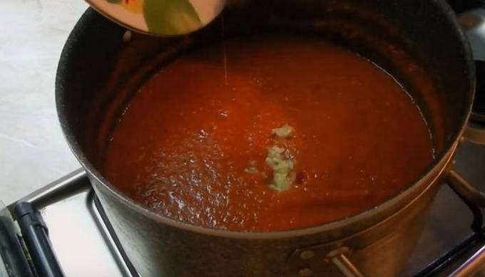 - Om de zaadjes en schillen van de peper te verwijderen, passeert u het mengsel door een zeef. Zet de pot ketchup weer op de brander. Voeg zout, suiker en kruiden toe.Verwijder de knoflookbol van tevoren en hak de knoflook fijn met een knoflookmaker. We sturen het naar een container met ketchup. We mengen de producten en koken ze ongeveer een half uur.