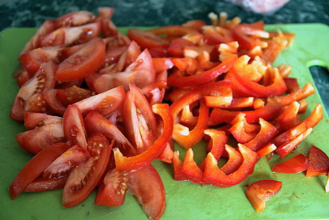 - We wassen de paprika's en tomaten. Veeg af met een keukenhanddoek. Verwijder de schil van de tomaten. Snijd de paprika in twee helften langs de groente. We verwijderen zaden en witte film. Snijd de tomaten in plakjes en de paprika in vrije plakjes.
