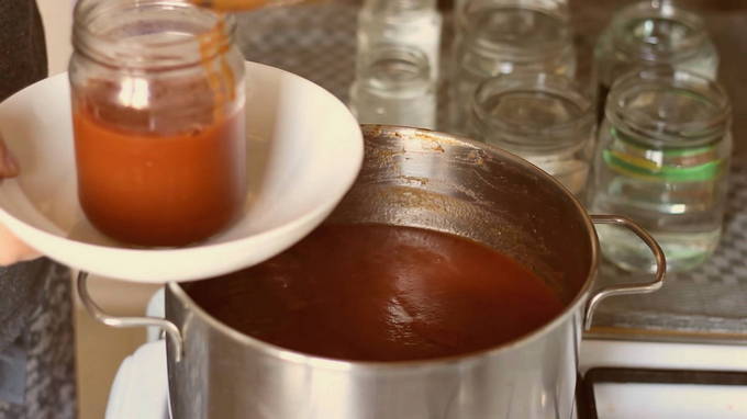 - We steriliseren potten en deksels. Giet vervolgens hete ketchup in potten en rol op. We draaien de blikken om en zetten ze neer met de deksels naar beneden. We leggen op de vloer om af te koelen.