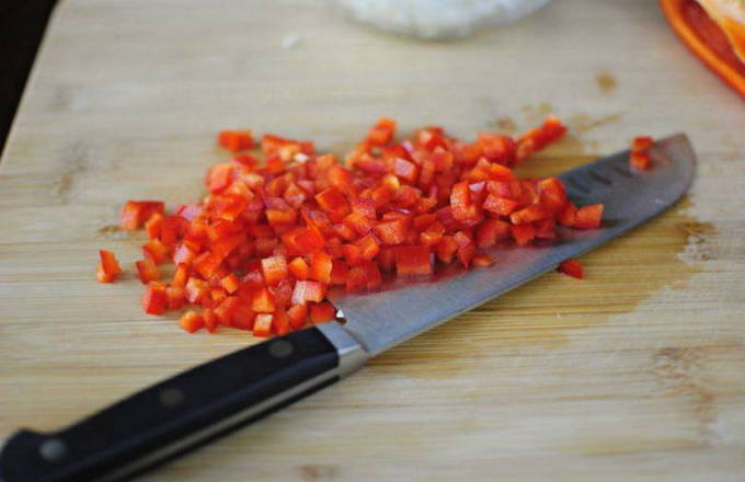 - Nu zijn de uien en paprika's aan de beurt. We wassen de peper met stromend water. We schillen de groenten: haal de ui uit de schil, snijd de paprika in de lengte in twee helften en verwijder het klokhuis. Gepelde uien en paprika's kunnen weer licht gewassen worden. Groenten in kleine stukjes snijden.