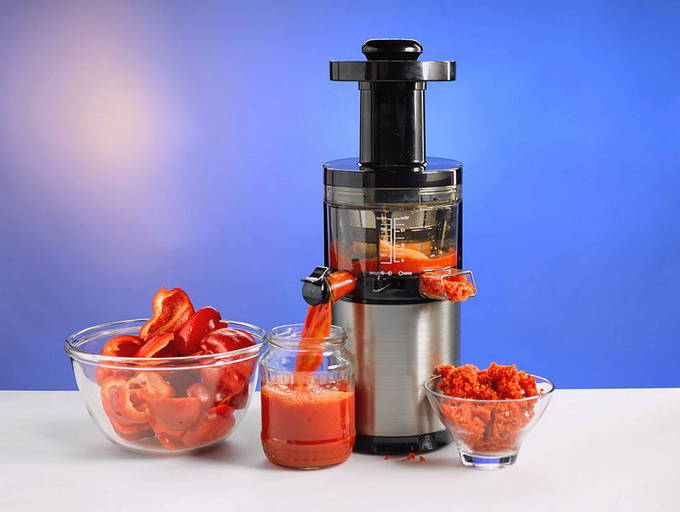 - Was eerst de tomaten en verwijder overtollig vocht met een theedoek. Vervolgens snijden we de groente in kleine stukjes en persen we het sap eruit met een speciaal apparaat of handmatig. Als u besluit tomaten te vervangen door tomatensap, hoeft u deze stap niet uit te voeren.