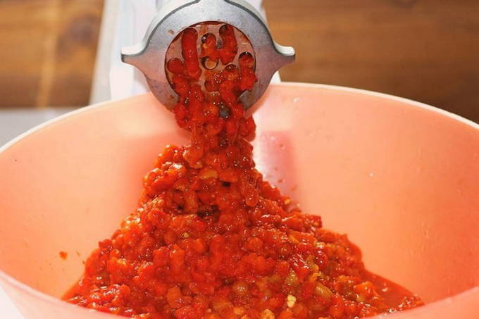 Tomaten-paprika ketchup door de vleesmolen voor de winter