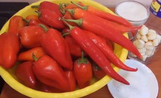 - Reinig de onder stromend water gewassen paprika's van zaden en tussenschotten, verwijder de stelen. Snijd de paprika's in blokjes van willekeurige grootte. Haal de peper en knoflook door een vleesmolen of keukenmachine.
